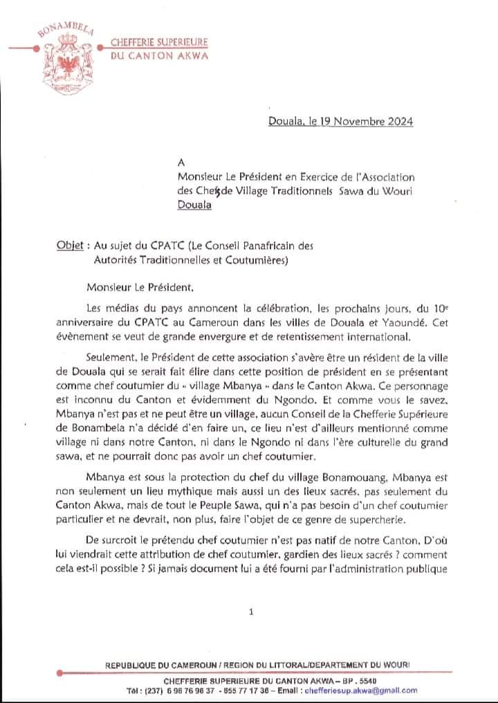 Dans cette note chefale, le monarque Sawa révèle que les médias locaux annoncent la célébration , dans les prochains jours, du 10e anniversaire du CPATC au Cameroun , notamment dans la ville de Douala et Yaounde. Un événement souligne – t- il , qui se veut de grande envergure et de retentissement international . Seulement , conteste la légitimité et la légalité de celui qui se fait passer pour le président du CPATC et par ricochet chef coutumier du village Mbanya, dans le Canton Akwa 《 Ce personnage est inconnu du canton et évidemment du Ngondo. Et comme vous le savez, Mbanya n’est pas et ne peut être un village, aucun conseil de la chefferie supérieure de Bonambela n’a décidé d’un d’en faire un , ce lieu n’est d’ailleurs mentionné comme village ni dans notre canton, ni dans le Ngondo ni dans notre canton, ni dans le Ngondo ni dans l’ère culturelle du grand Sawa, et ne pourrait donc pas avoir un chef coutumier 》 peut – on lire dans la correspondance du chef Supérieur des Bonambela.
