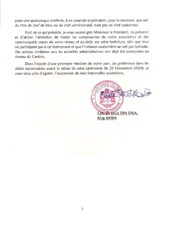 Le chef supérieur du Canton , Sa Majesté Dr. Louis Din Dika a saisi par correspondance le 19 Novembre 2024 , le président en Exercice de l’Association des chefs du Village Traditionnels Sawa du Wouri Douala, afin de dénoncer l’imposture d’un prétendu chef coutumier du village Mbanya, qui se serait fait élire dans cette position comme Président du Conseil Panafricain des Autorités Traditionnelles et coutumières ( CPATC).