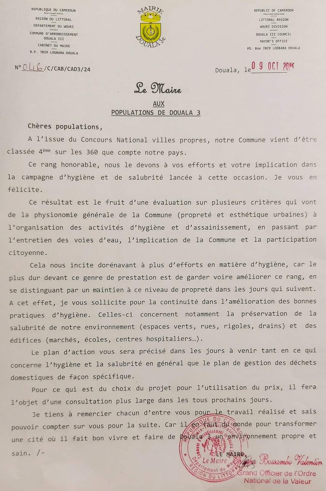Un « rang honorable » qui, selon le maire est le fruit des efforts et de l’implication des populations de Douala 3 dans la campagne d’hygiène. et de salubrité lancée à cette occasion. Dans la correspondance qu’il a adressée à ses populations. le 09 octobre 2024, Valentin Epoupa Bossambo a tenu à . féliciter les habitants de Douala 3 pour ce résultat, fruit d’une évaluation sur plusieurs critères qui vont de la physionomie générale de la commune (propreté et d’esthétique urbaine), à l’organisation des activités d’hygiène et d’assainissement, en passant par l’entretien des voies d’eau, l’implication de la commune et la participation citoyenne.