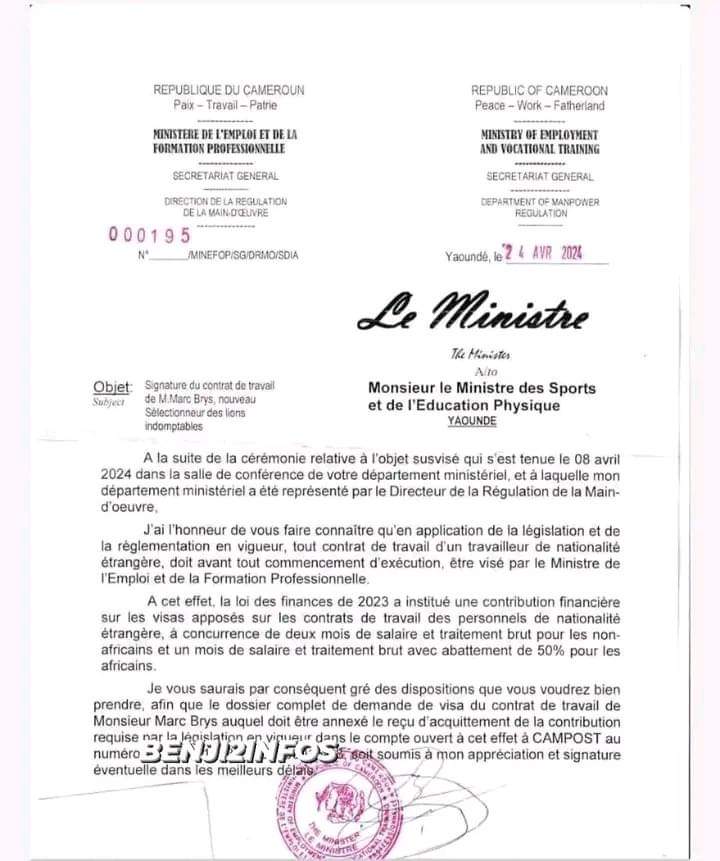 LE MINISTRE de l’Emploi et de la Formation Professionnelle ISSA TCHIROM BAKARY Envoi une lettre à MOELLE KOMBI MINISTRE DES SPORTS pour lui rappeler que MARC BRYS n’a pas le droit de travailler pour l’État du CAMEROUN car n’ayant pas un contrat signé en bonne et dû forme reconnu par le MINISTÈRE DU TRAVAIL car son dossier est incomplet n’ayant pas respecté la procédure normale