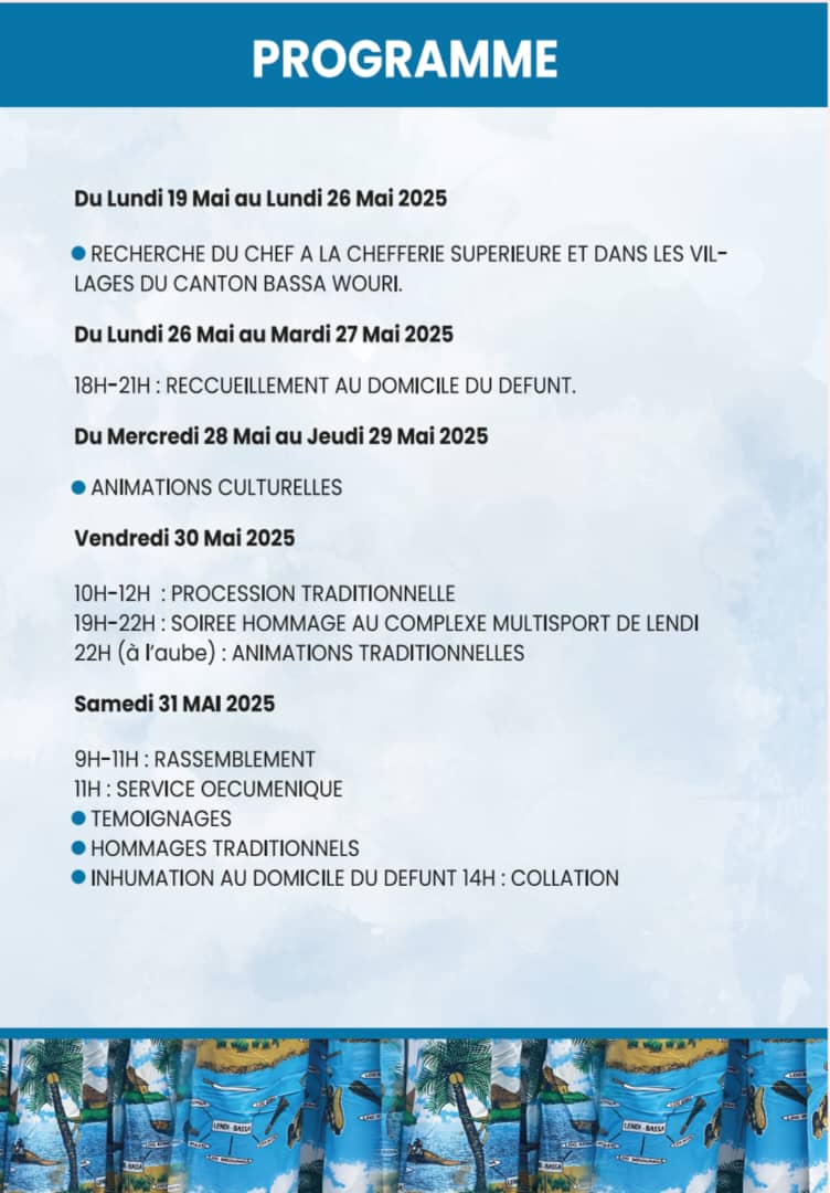 Le village Lendi, situé dans le 5ème arrondissement de la ville de Douala, est en deuil. Sa Majesté Joseph Mpondo Etame, chef de troisième degré et digne fils de la communauté Sawa, nous a quittés le 8 décembre 2024 des suites d’une maladie. Les obsèques officielles auront lieu les 30 et 31 mai 2025 dans son village natal.