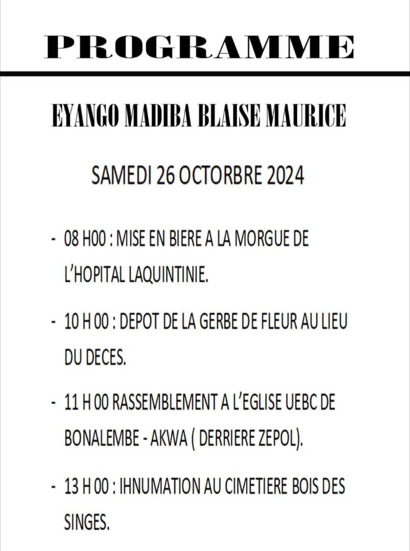 Les obsèques de ce jeune camerounais âgé de 40 ans sont annoncées pour le samedi 26 octobre 2024 à Douala conformément au programme qui a été élaboré.