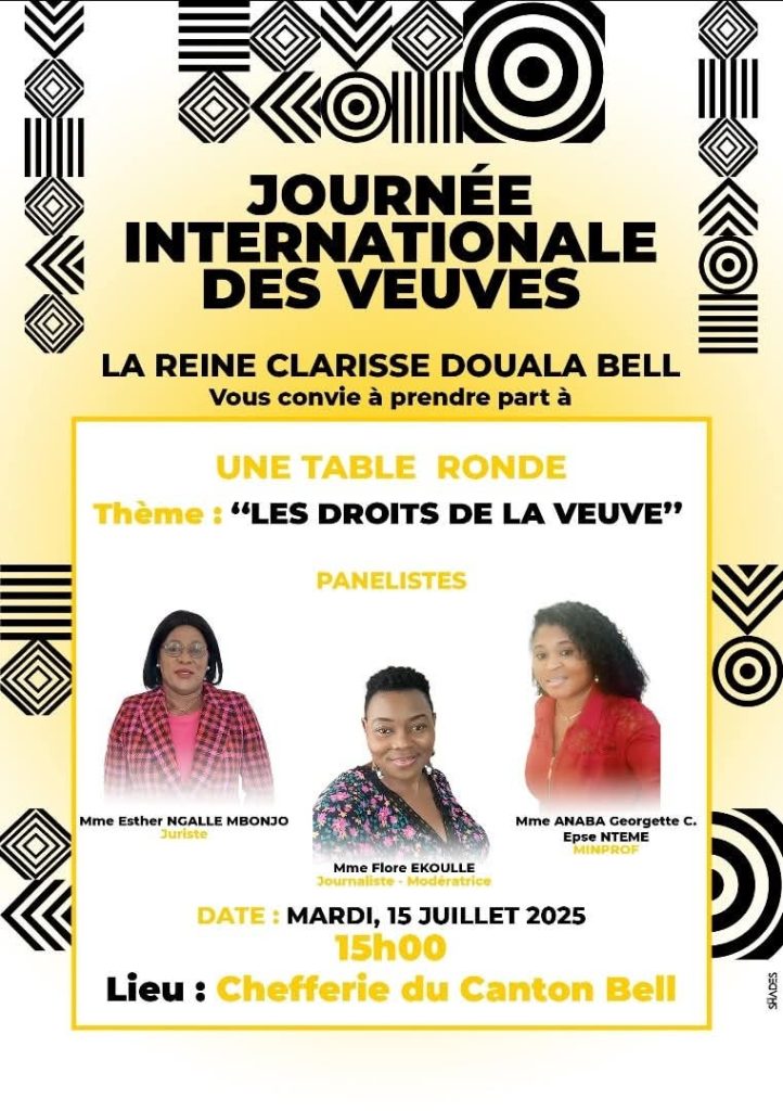 Le Cameroun se joint à la communauté internationale pour célébrer la Journée internationale des veuves. À cette occasion, une table ronde exceptionnelle se tiendra le mardi 15 juillet 2025 à 15h00 à la Chefferie du Canton Bell, sous le haut patronage de la Reine Clarisse Douala Bell.