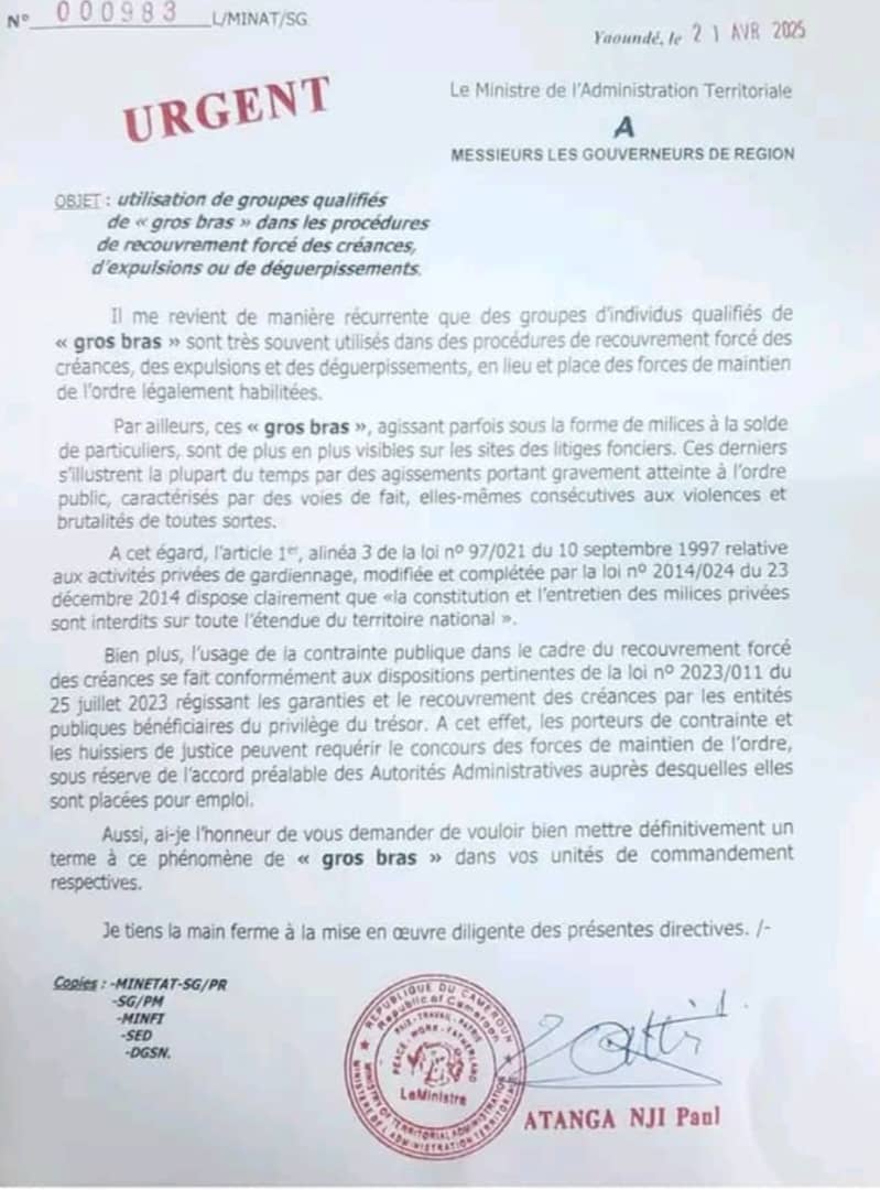 Le Ministre de l’Administration Territoriale Paul Atanga Nji  a pris une décision forte pour mettre un terme à l’utilisation de groupes qualifiés de « gros bras » dans les procédures de recouvrement forcé des créances, d’expulsions et de déguerpissements. Ces groupes, souvent sous la forme de milices privées, agissent en lieu et place des forces de maintien de l’ordre légalement habilitées, portant gravement atteinte à l’ordre public.