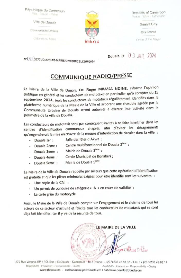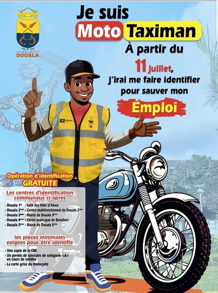 Suite à un communiqué parvenu à notre rédaction ce 05 juille 2024, signé de Dr. Roger Mbassa Ndine maire de la ville de Douala, il ressort que : le Maire de la Ville, informe l’opinion publique en général et les conducteurs de mototaxis en particulier qu’à compter du 15 septembre 2024, seuls les conducteurs de mototaxis régulièrement identifiés dans la plateforme numérique de la Mairie de la Ville et arborant une chasuble agréée par la Communauté Urbaine de Douala seront autorisés à exercer leur activité dans le périmètre de la ville de Douala.