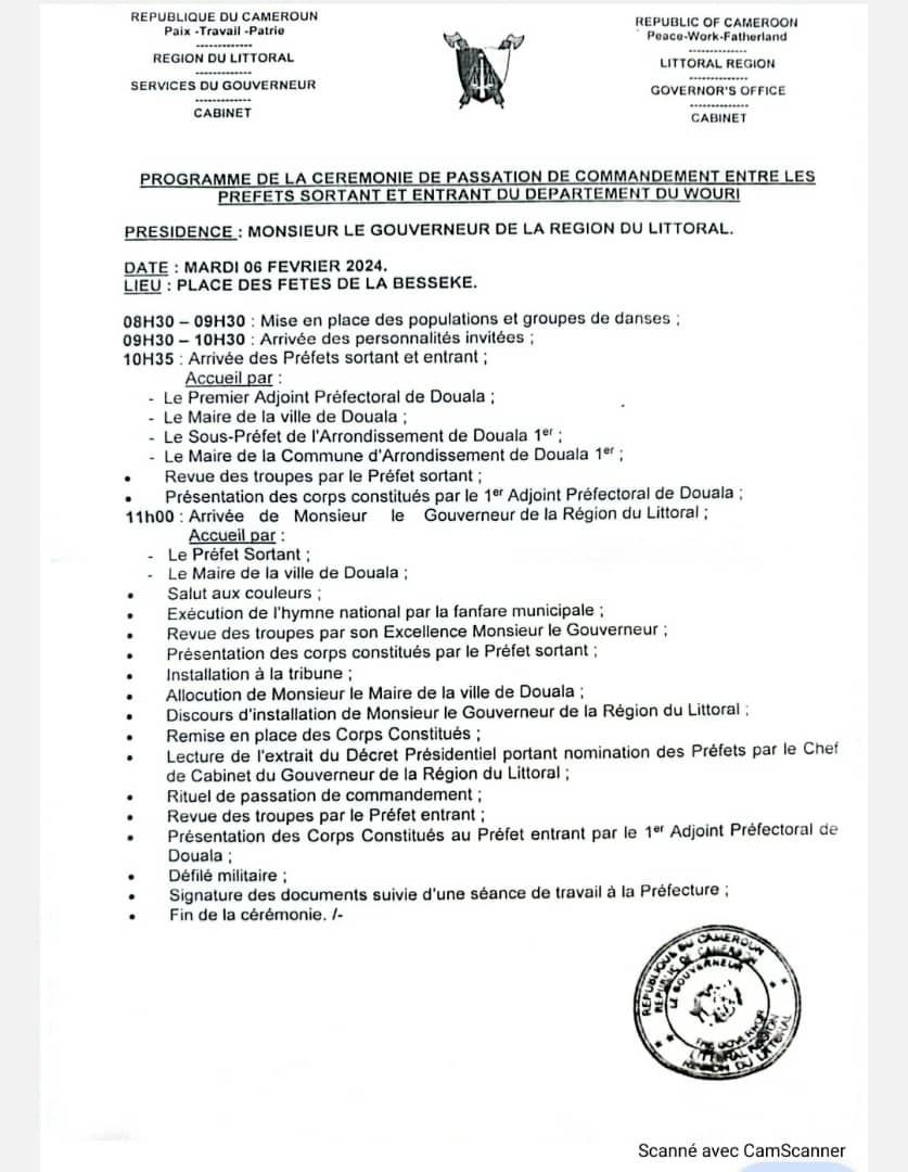 La Cérémonie de passation de Commandement entre Benjamin Mboutou les préfets sortant et Sylvac Mari Mvogo entrant du département du Wouri se tient ce Mardi 06 Février 2024 à la place de la Besseke à partir de 10h . Cérémonie placée sous la présidence du Gouverneur de la Région du littoral Samuel Dieudonné Ivaha Diboua.