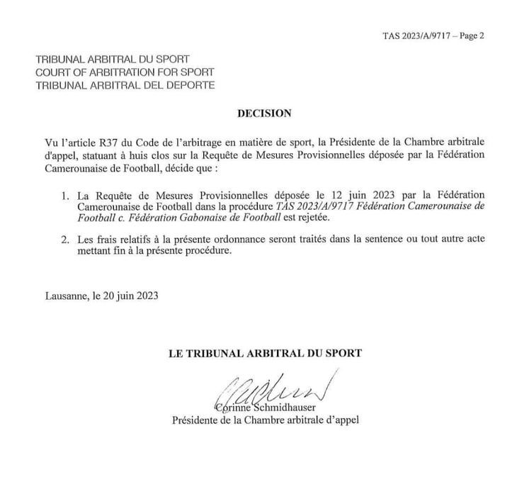 L’espoir pour les Lions U23 de participer à la Coupe d’Afrique des nations de leur catégorie est de plus en plus mince. « Vu l’article R37 du Code de l’arbitrage en matière de sport, la présidente de la chambre arbitrale d’appel, statuant à huis-clos sur la requête des mesures prévisionnelles déposée par la Fécafoot, décide que : la requête des mesures prévisionnelles déposée par la Fédération camerounaise de football dans la procédure Tas 2023/A9717Fédération camerounaise de football c/Fédération gabonaise de football est rejeté », peut-on lire dans le document singé le 20 juin 2023 de Corine Schmihauser. En clair, le Gabon reste pour l’heure qualifié pour cette compétition qui va démarrer le 24 juin 2023 au Maroc.
