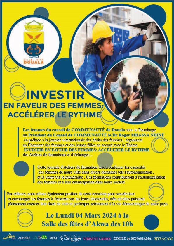 Journée pleinement bénéfique pour les 200 femmes et plus qui ont effectué le déplacement de la salle des fêtes d’Akwa, le lundi, 04 mars 2024. En prélude à la journée qui célèbre les droits de la femme, le 8 mars prochain, les femmes du Grand Conseil de la mairie de la ville de Douala ont organisé une série d’activité, afin d’édifier les femmes sur le thème choisi pour cette édition du 8 mars, et de les former afin de les Capacités à être autonomes financièrement.