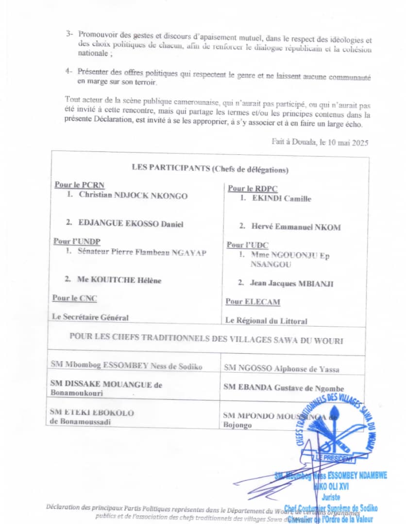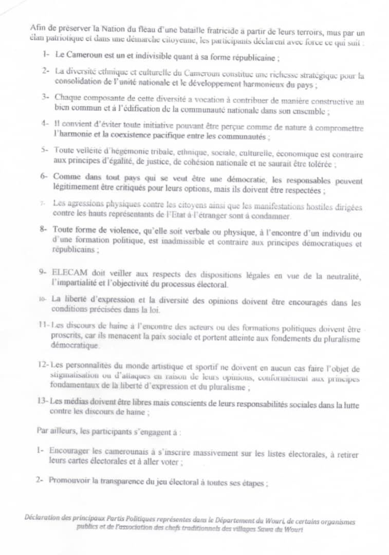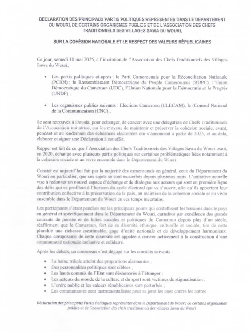 Les participants à cette rencontre ont signé une déclaration commune dans laquelle ils réaffirment leur attachement à la forme républicaine du Cameroun et à la diversité ethnique et culturelle du pays. Ils ont également convenu de promouvoir des gestes et discours d’apaisement mutuel, dans le respect des idéologies et des choix politiques de chacun, afin de renforcer le dialogue républicain et la cohésion nationale.