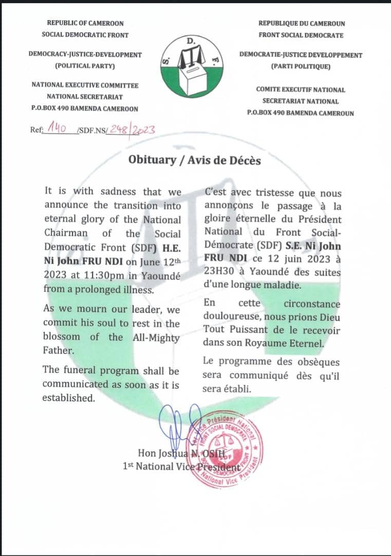 Selon un communiqué rendu public par le 1er vice- président du parti l’honorable Joshua Osih, le leader du SDF ( Social Democratic Front ) est décédé le 12 juin 2023 aux environs de 23h30 à Yaounde des suites d’une longue maladie.