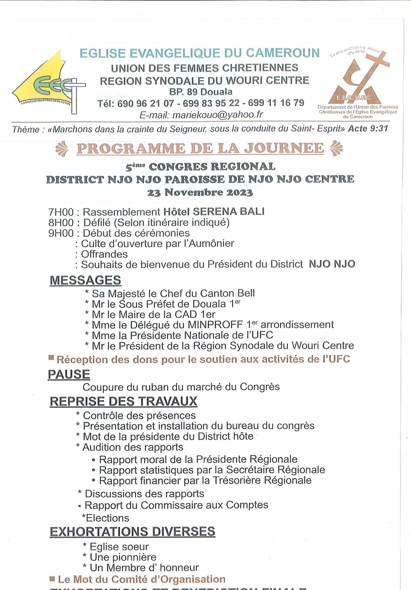 《 Marchons dans la Crainte du Seigneur sous la conduite du saint esprit .》Actes 9:31. C’est le thème annuel de ce 5e Congrès électif de l’UFC / RSW Centre qui s’ouvre ce jeudi 23 Novembre 2023 à Douala. De cette thématique , découle un sous – thème phare à savoir : 《la Marche 》. L’un des enjeux majeurs de ce Congrès , est l’élection d’un nouveau bureau entrant de l’UFC / RSW Centre pour un mandat de 5ans. Autre activité prévue pour ces assises , c’est la lecture du rapport des activités annuelles pour l’année 2023 , parmi la présidente du bureau sortant. Parmi les membres ayant fait acte de Candidature , figure Marie Kouo Moudiki , par ailleurs présidente du bureau sortant qui a seulement passé deux années à la tête de cette organisation . En guise de rappel, elle avait été sollicitée en urgence vers la fin de l’année 2021 par la hiérarchie de l’Eglise afin de sauver ce Mouvement qui menaçait de disparition au lendemain de la crise qui a secoué l’Eglise durant ces dernières années.